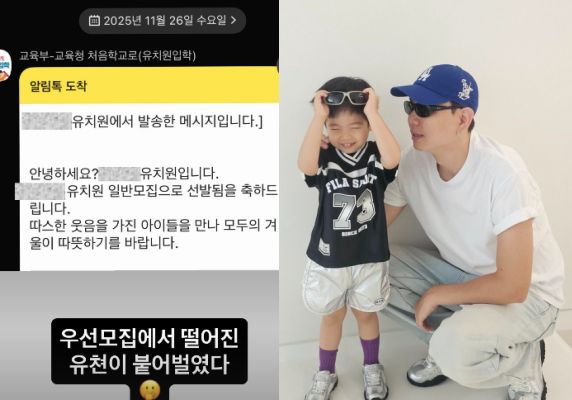 제이쓴이 아들의 유치원 합격 소식을 전했다. 제이쓴은 26일 개인 채널에 “우선모집에서 떨어진 유치원이 붙어버렸다”라는 글을 게재했다. 제이쓴이 공개한 사진에는 교육부에서 발송한 메시지가 담겨 있으며 아들 준범 군의 유치원 합격 소식이 담겨 있다. 앞서 제이쓴은 우선모집 시기에 신청한 유치원에서 일명 ‘광탈’을 했다며 “환장하겠는데”라는 격한 반응을 보인