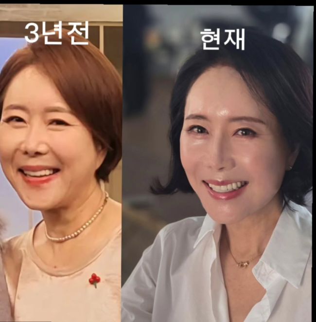 아나운서 출신 방송인 윤영미가 성형 시술에 만족한 근황을 공개했다. 윤영미는 22일 자신의 계정에 "3년 전과 현재. 안면거상 두 달째. 점점 자연스러워진다. ㅎ 특히 목거상이 만족스럽다. (눈도 끌어올렸음)"이라며 "두 사진 다 풀메이크업 한건데 다이어트 효과도 큰 듯"이라는 글을 남겼다. 이와 함께 3년 전과 최근 촬영한 모습을 비교한 사진을 공개했다.