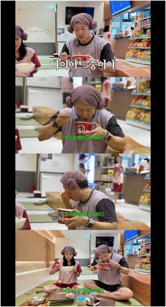 <리뷰 : 방송 시청 후 작성된 리뷰 기사입니다.> ‘유진VS태영’ 배우 기태영이 난데없이 다이어트를 선언한 가운데 유진이 이해가 되지 않는 표정을 지었다. 25일 배우 유진과 기태영 부부의 유튜브에서는 ‘찜질방에서 라면 먹다가 오윤희까지 소환된 날 유진 VS 기태영’이란 영상이 공개됐다. 유진과 기태영 부부는 처음으로 찜질방 데이트를 즐겼다. 결혼 전 유