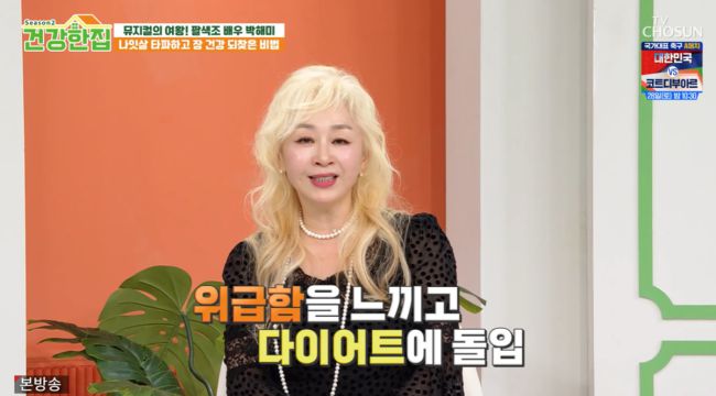 배우 박해미가 다이어트 성공 근황을 밝혔다. 24일 방송된 TV조선 '건강한 집2'에는 박해미가 출연했다. 이날 박해미는 '건강한 집'을 찾은 이유에 대해 "늘 50kg대로 적정한 몸무게를 유지했기 때문에 딱히 몸무게에 신경을 쓰지 않았다"고 입을 열었다. 이어 "어느 날 체중을 쟀더니 8kg가 증가했다. 이게 웬일이냐. 앞자리가 바뀌면서 60kg대로 되는