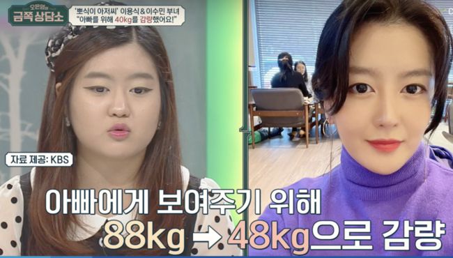 '오은영의 금쪽 상담소'에서 이용식 딸 이수민이 40kg 감량했던 사실을 고백했다. 5일 방송된 채널A 예능 '오은영의 금쪽 상담소'이 전파를 탔다. 이날 게스트에 대해 “무려 데뷔 49년차 현역 개그맨 원조 뽀통령 뽀식이 아저씨”라며 개그맨 이용식을 소개했다 개그계 대부인 이용식이 딸 이수민과 함께 출연했다. 박나래는 이수민에 대해 “따님 보는 건 처음,