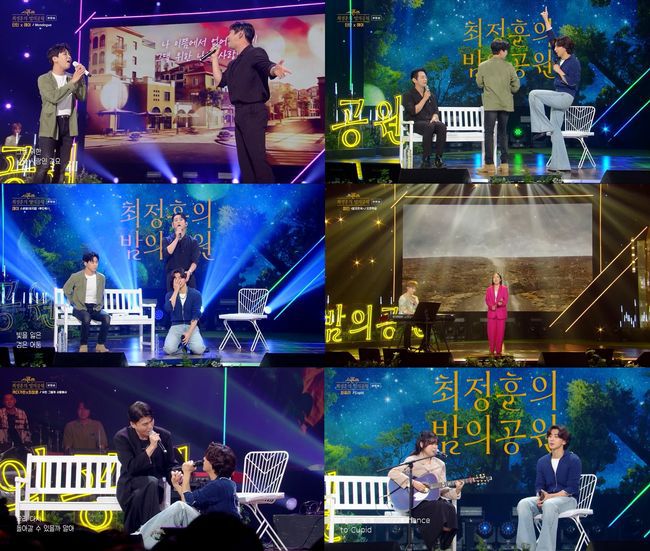 ‘더 시즌즈-최정훈의 밤의 공원’이 특별한 음악 산책으로 금요일 밤을 채웠다. 지난 16일 방송된 KBS 2TV ‘더 시즌즈-최정훈의 밤의 공원’에는 가수 테이와 딘딘, 정인, 최유리, 카더가든이 출연해 다채로운 무대와 토크를 선보였다. 첫 게스트로 포문을 연 테이, 딘딘은 최근 테이가 리메이크한 버즈의 ‘모놀로그’ 듀엣 무대로 뜨거운 박수를 받았다. 딘딘