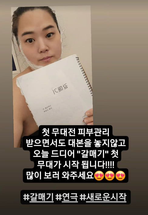 사진=수지 씨 SNS 가수 미나의 시누이 수지 씨가 새로운 도전을 시작을 코앞에 뒀다. 수지 씨는 22일 자신의 인스타그램 스토리에 "첫 무대 전 피부관리 받으면서도 대본을 놓지 않고, 오늘 드디어 '갈매기' 첫 무대가 시작됩니다!! 많이 보러 와주세요"라는 문구와 함께 한 장의 사진을 게재했다. 공개된 사진 속에서 수지 씨는 상의 탈의를 한 채 연극 대본