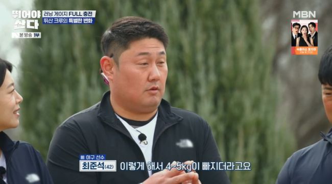 최준석이 1일 1식을 실천하며 체중 감량을 하고 있다고 밝혔다. 3일 방송된 MBN '뛰어야 산다' 3회에서 몇 멤버들은 달라진 모습으로 등장했다. 이날 방은희는 "목 디스크가 생겼다"며 깁스를 하고 나타나 눈길을 끌었다. 이어 "한 가지 좋은 점은 무릎 나이가 25~30세가 나왔다. 목은 80대"라고 덧붙였다. 달라진 모습으로 등장한 건 방은희 뿐만이 아