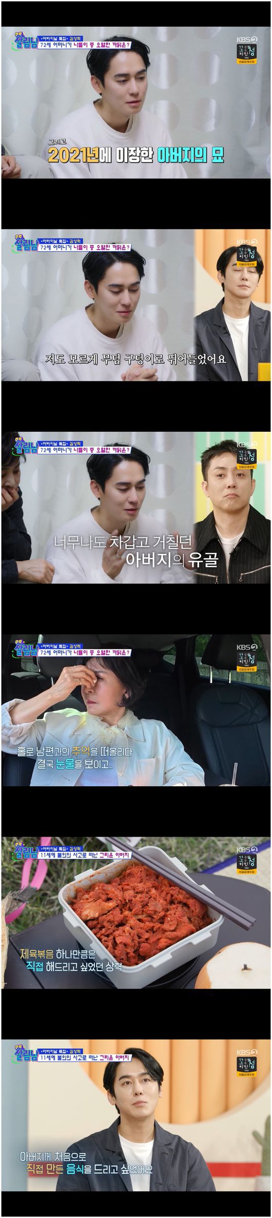 '살림남2' 클릭비 출신 김상혁이 가정의 달에 대한 깊은 소감을 드러냈다. 10일 방영된 KBS2TV 예능 '살림남2'에서는 박서진의 빙고를 점점 완성해가는 박효정, 그리고 어버이날 등을 맞이해 어머니와 함께 아버지의 묘소를 찾은 김상혁의 모습이 그려졌다. 박효정과 박서진은 서로에게 바라는 빙고를 그린 적이 있다. 박서진은 이미 박효정에게 아르바이트 하기