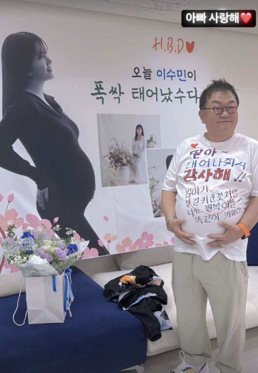 코미디언 이용식이 출산을 앞둔 딸 이수민의 생일을 축하했다. 14일 이용식의 딸 이수민은 자신의 SNS를 통해 "아빠 사랑해"라는 글과 함께 사진을 게재했다. 공개된 사진 속에는 "H.B.D 오늘 이수민이 폭싹 태어났수다"라는 문구가 적힌 현수막이 담겼다. 이수민의 생일을 축하하기 위해 제작된 것. 특히 그 앞에는 아빠 이용식이 선 가운데, "딸아, 태어나