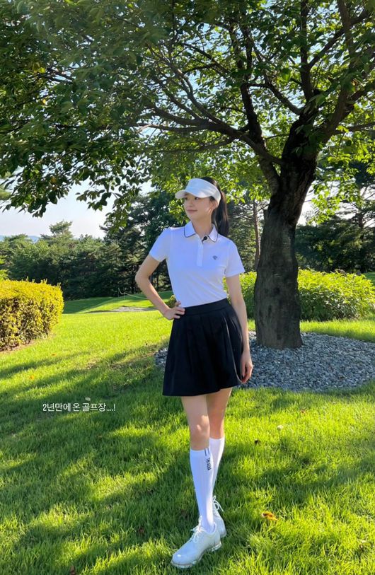 전 리듬체조 국가대표 손연재가 2년 만에 취미를 즐겼다. 24일 손연재는 자신의 소셜 계정에 사진 한 장을 공개했다. 썬캡에 화이트 칼라의 폴로 티셔츠, 그리고 테니스 스커트에 니 삭스를 갖춰 신은 손연재는 골프채를 든 채 산뜻한 웃음을 지었다. 손연재는 "2년 만에 온 골프장"이라며 즐거움을 보였다. 임신과 출산 전 손연재는 종종 골프장을 찾는 모습을 보