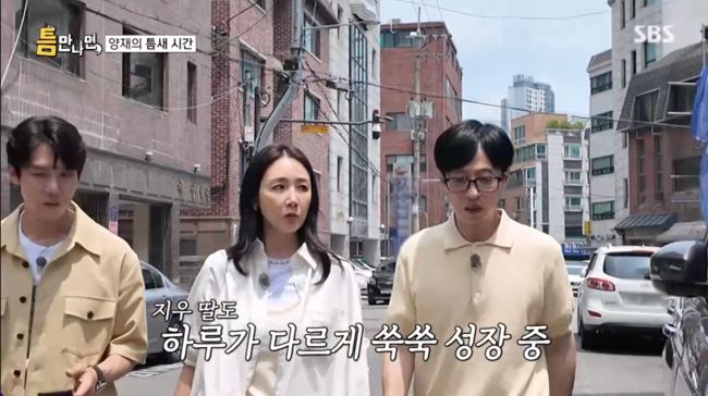 '틈만 나면,’ 배우 최지우가 5살 딸에게 너튜브를 보여주지 않는다는 육아 소신을 밝혔다. 8일 오후 방송된 SBS 예능 프로그램 '틈만 나면,'에서는 '틈 친구'로 배우 최지우가 출격했다. 유재석, 유연석, 그리고 최지우는 효과음 작업을 하는 폴리 아티스트의 작업실을 찾았다. 작업하는 소리를 들은 세 사람은 신기해하는 모습을 보였다. 틈 친구들인 폴리 아