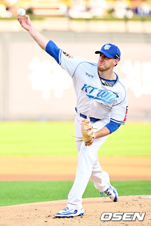 10일 오후 수원 KT위즈파크에서 ‘2025 신한 SOL BANK KBO리그’ KT 위즈와 삼성 라이온즈의 경기가 진행됐다. 이날 KT는 패트릭, 삼성은 최원태를 선발투수로 내세웠다. KT 선발 패트릭이 마운드 위에서 힘차게 공을 뿌리고 있다. 2025.08.10 / rumi@osen.co.kr