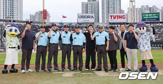 10일 부산 사직야구장에서 2025 신한 SOL 뱅크 KBO 리그 롯데 자이언츠와 SSG 랜더스의 경기가 열렸다. 홈팀 롯데는 박세웅이, 방문팀 SSG는 김건우가 선발 출전했다. 최수원 심판이 3천경기 달성 기념 KBO 시상식을 갖고 동료심판들과 기념촬영을 하고 있다. 2025.08.10 / foto0307@osen.co.kr