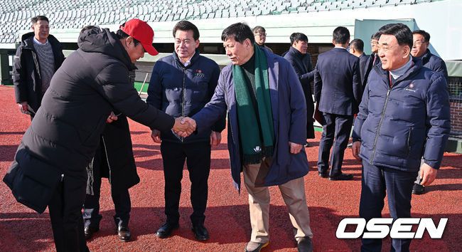 13일 울산 문수야구장에서 울산 웨일즈 트라이아웃이 열렸다. 정원 35명 모집에 무려 230명이 지원한 KBO 퓨처스리그 최초의 시민구단 울산 웨일즈는 13·14일 이틀간의 트라이아웃을 거쳐 15일 합격자를 발표한다. 허구연 KBO 총재와 김두겸 울산 시장이 울산 웨일즈 코치들과 인사를 하고 있다. 2026.01.13 / foto0307@osen.co.kr