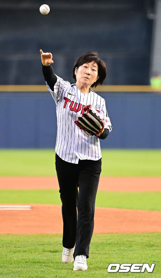 18일 오후 서울 잠실야구장에서 ‘2023 신한은행 SOL KBO리그’ LG 트윈스와 NC 다이노스의 경기가 열렸다. 한화진 환경부 장관이 시구자로 나서 공을 던지고 있다. 2023.04.18 / dreamer@osen.co.kr