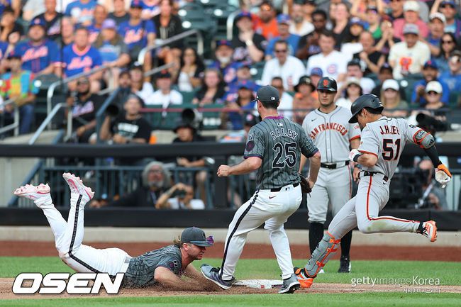 [사진][사진] 샌프란시스코 이정후(오른쪽)가 8회 땅볼을 친 뒤 1루로 전력 질주하고 있다. 뉴욕 메츠 1루수 피트 알론소가 몸을 날려 1루를 찍으며 아웃을 잡아냈다. 가운데는 메츠 투수 브룩스 레일리. ⓒGettyimages(무단전재 및 재배포 금지)ⓒGettyimages(무단전재 및 재배포 금지) 한국에 이어 미국에서도 결국 만났다. 이정후(27·샌프