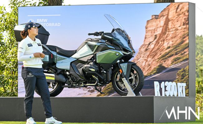 미국여자프로골프(LPGA)투어 대회인 BMW 레이디스 챔피언십(총상금 230만 달러) 1라운드 경기가 16일 전남 해남군 파인비치 골프링크스(파72)에서 진행됐다. 고진영이 3번 홀 티샷을 기다리며 코스에 전시된 바이크 앞에서 그린을 바라보고 있다. 한편 한국에서 열리는 유일한 LPGA 투어인 BMW 레이디스 챔피언십(총상금 230억달러)은 16일부터 19