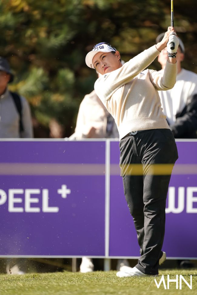 15일 경주에 위치한 경주 마우나오션 컨트리클럽(파72ㅣ6,556야드)에서 2025 시즌 대미를 장식할 '위믹스 챔피언십 2025'(총상금 10억 원ㅣ우승 상금 3억 원) DAY1 싱글매치플레이가 열렸다. 지한솔이 2번홀 경기를 펼치고 있다. 이가영(NH투자증권), 지한솔(동부건설) 경기 연장전에 돌입했다.