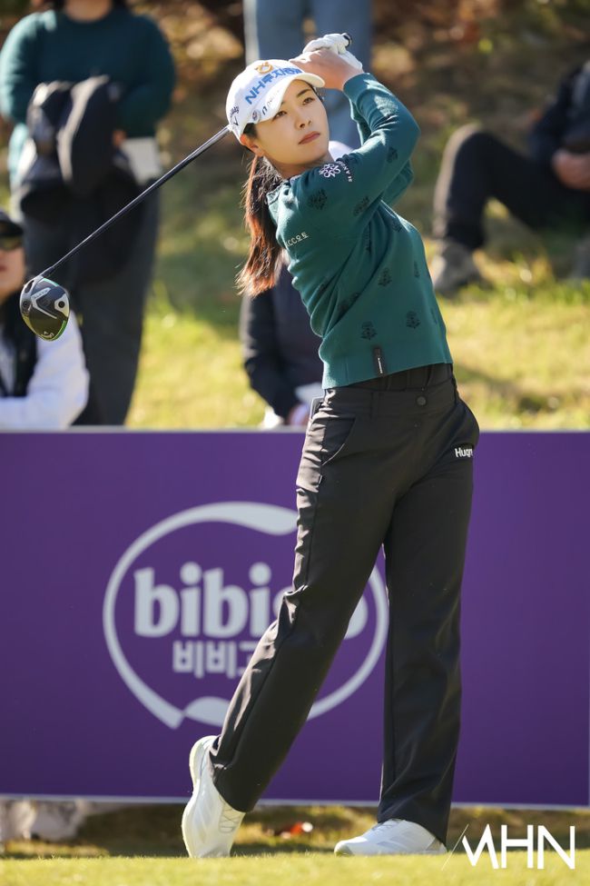 15일 경주에 위치한 경주 마우나오션 컨트리클럽(파72ㅣ6,556야드)에서 2025 시즌 대미를 장식할 '위믹스 챔피언십 2025'(총상금 10억 원ㅣ우승 상금 3억 원) DAY1 싱글매치플레이가 열렸다. 이가영이 2번홀 경기를 펼치고 있다. 이가영(NH투자증권), 지한솔(동부건설) 경기 연장전에 돌입했다.