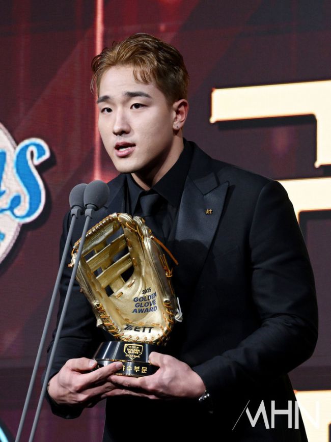 2025 신한은행 SOL 뱅크 KBO 골든글러브 시상식이 9일 오후 서울 송파구 잠실 롯데호텔 월드에서 열렸다. KT 위즈 안현민이 외야수 부문을 수상하고 소감을 말하고 있다. 한편, 2025 KBO 골든글러브는 KBO리그 각 포지션에서 최고의 활약을 펼친 선수를 뽑는 시상식이다.