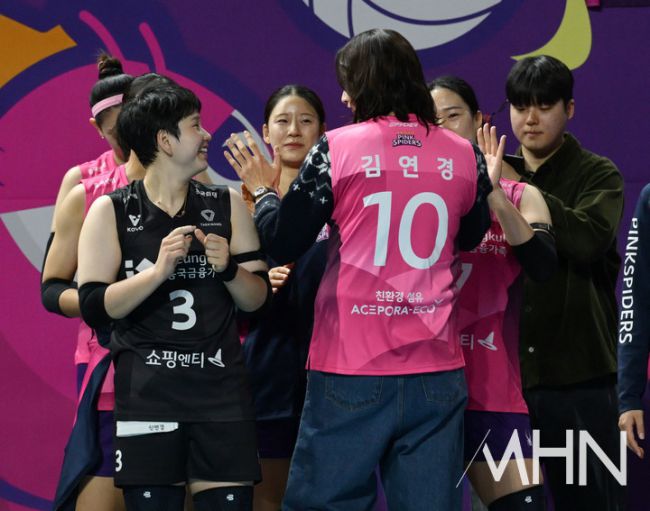 24일 오후 인천 삼산체육관에서 진에어 2025-2026 V리그 여자부 흥국생명과 IBK기업은행의 경기가 열렸다. 이날 김연경 흥국생명 어드바이저가 선수들과 인사를 나누고 있다.
