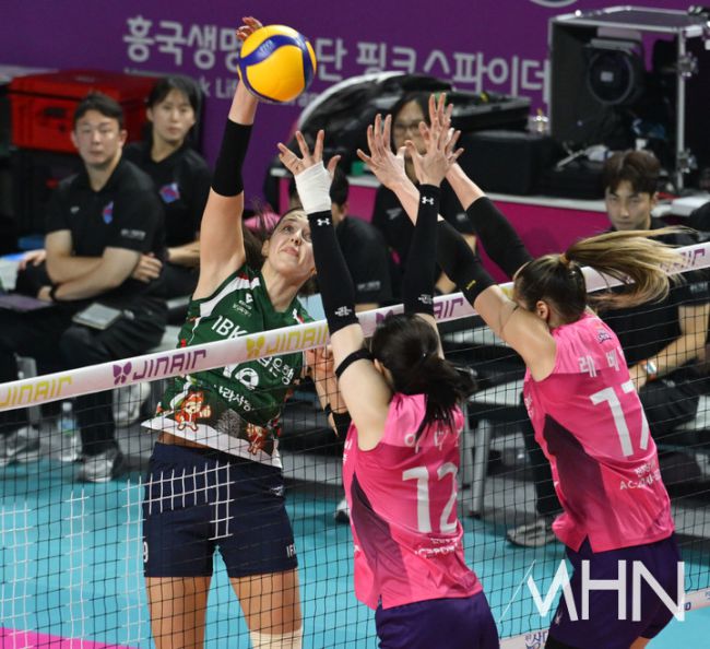 24일 오후 인천 삼산체육관에서 진에어 2025-2026 V리그 여자부 흥국생명과 IBK기업은행의 경기가 열렸다. IBK기업은행 육서영이 공격을 시도하고 있다. 한편, 이날 경기는 흥국생명이 IBK기업은행을 세트스코어 3-0으로 꺾고 승리했다.