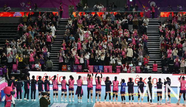24일 오후 인천 삼산체육관에서 진에어 2025-2026 V리그 여자부 흥국생명과 IBK기업은행의 경기가 열렸다. 흥국생명 선수들이 승리에 기뻐하고 있다. 한편, 이날 경기는 흥국생명이 IBK기업은행을 세트스코어 3-0으로 꺾고 승리했다.