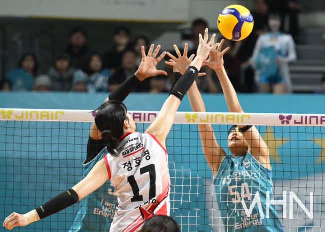 20일 서울 장충체육관에서 '2025-2026 V-리그 여자부' GS칼텍스와 정관장 경기가 열렸다. 정관장 정호영이 공격을 시도하고 있다.