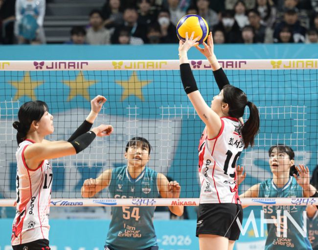 20일 서울 장충체육관에서 '2025-2026 V-리그 여자부' GS칼텍스와 정관장 경기가 열렸다. 정관장 최서현이 세트를 시도하고 있다.