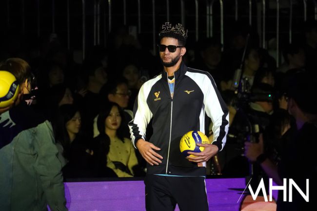 25일 춘천 호반체육관에서 '진에어 2025~2026 V-리그 올스타전'이 열렸다. 현대건설 양효진이 역대 최다 17번째 올스타 무대에 오르고, 한국전력 신영석은 6시즌 연속 팬투표 1위로 출전했다. 레오가 입장하고 있다.