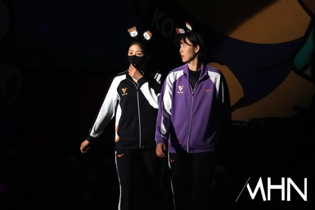 25일 춘천 호반체육관에서 '진에어 2025~2026 V-리그 올스타전'이 열렸다. 현대건설 양효진이 역대 최다 17번째 올스타 무대에 오르고, 한국전력 신영석은 6시즌 연속 팬투표 1위로 출전했다. 박혜민, 박정아가 입장하고 있다.