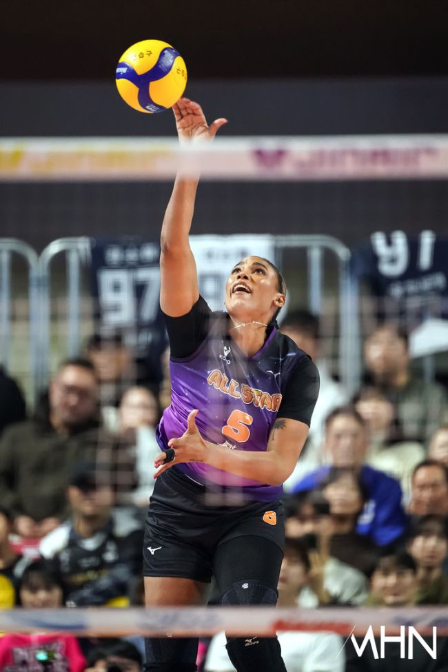 25일 춘천 호반체육관에서 '진에어 2025~2026 V-리그 올스타전'이 열렸다. 현대건설 양효진이 역대 최다 17번째 올스타 무대에 오르고, 한국전력 신영석은 6시즌 연속 팬투표 1위로 출전했다. 실바가 스파이크 서브 퀸 콘테스트 경기를 펼치고 있다.