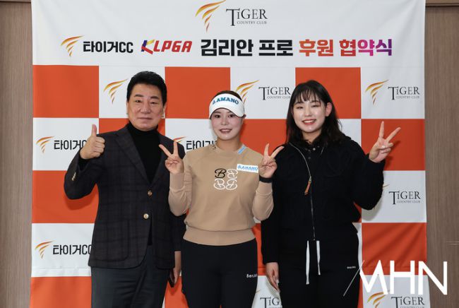 16일 경기도 파주시 법원읍에 위치한 타이거컨트리클럽(회장 박정희)에서 김리안프로 후원 협약식이 열렸다. 조인식 후 박정희 회장과 김리안이 포토월에 서서 포즈를 취하고 있다. 사진ㅣ골프채널 윤현준 기자