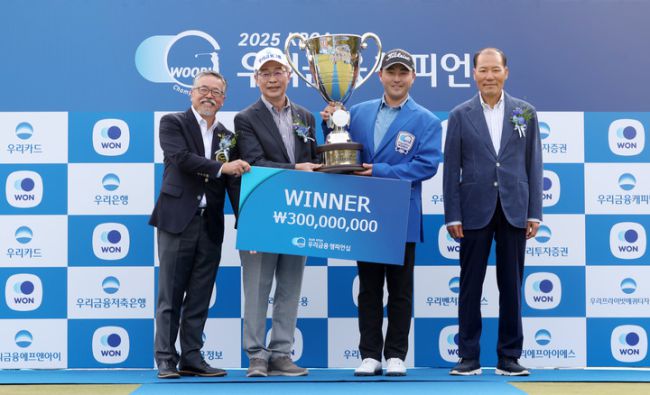 27일 오후 경기도 파주시 서원밸리GC 밸리, 서원코스에서 열린 한국프로골프(KPGA) 투어 '2025 KPGA 우리금융 챔피언십' 4라운드 경기에서 이태훈이 연장 승부 끝에 우승을 차지했다. 이날 우승을 차지한 이태훈이 (좌측부터)KPGA 김원섭 회장, 우리금융그룹 임종룡 회장, 대보그룹 최등규 회장과 포토타임을 갖고 있다. 이태훈은 강태영, 박준홍과 연