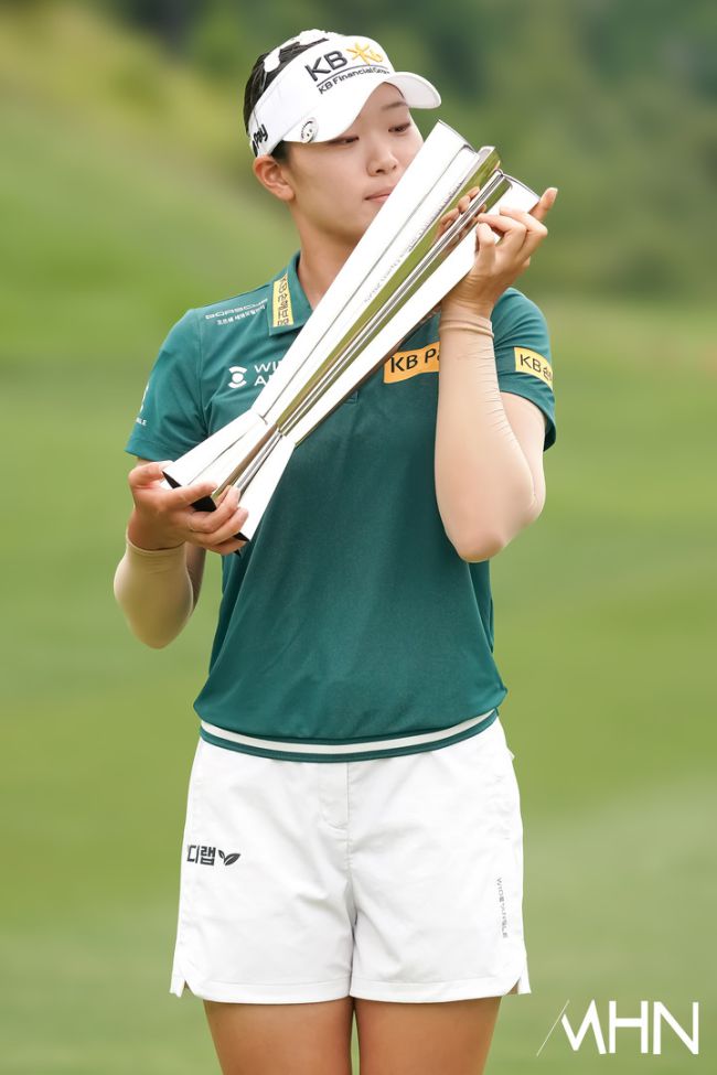 [mhn포토] 방신실, 짜릿한 역전 우승 트로피에 키스
