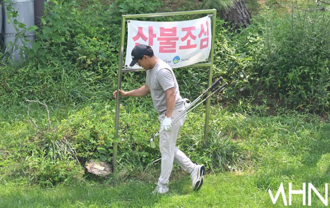 'KMAGF 2025 경동인베스트 그린투어' 8차전 경기가 29일 오전 경기도 광주시 뉴서울CC 문화코스에서 진행됐다. 이날 한 참가자가 샷을 위해 표지판을 확인하고 있다.