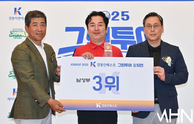 'KMAGF 2025 경동인베스트 그린투어' 8차전 경기가 29일 오전 경기도 광주시 뉴서울CC 문화코스에서 진행됐다. 이날 경기에서 1 언더파로 3위를 한 김준배가 한국미드아마추어골프연맹 문종열 부회장, 경동인베스트 정승진 대표와 포토타임을 갖고 있다.