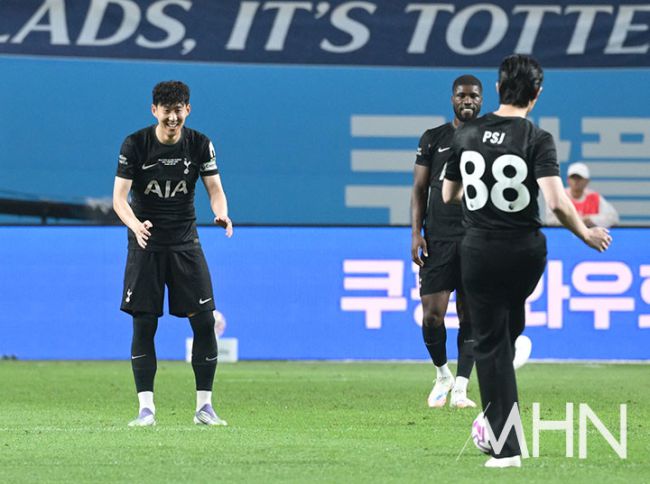'2025 쿠팡플레이 시리즈' 잉글랜드 프로축구 프리미어리그(EPL) 토트넘 홋스퍼와 뉴캐슬 유나이티드 FC의 경기가 3일 오후 서울 마포구 서울월드컵경기장에서 열렸다. 배우 박서준이 손흥민을 향해 시축을 하고 있다. 한편, 손흥민은 잉글랜드 프로축구 프리미어리그(EPL) 토트넘 홋스퍼와 10년간의 동행을 마무리하고 새로운 도전에 나서기로 결정했다.