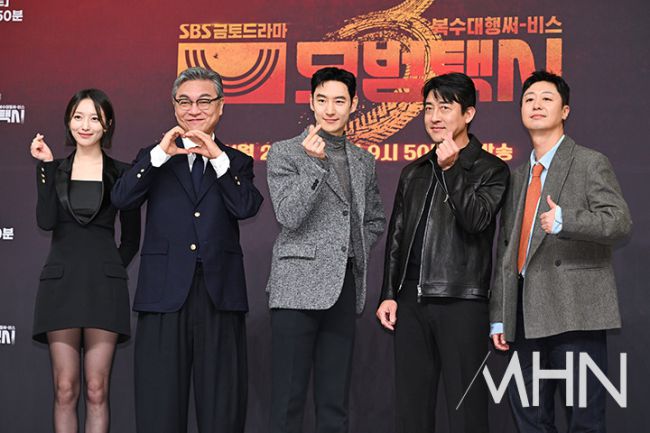 배우 표예진, 김의성, 이제훈, 장혁진, 배유람이 18일 오후 서울 양천구 SBS 목동에서 진행된 SBS 금토드라마 '모범택시3' 제작발표회에 참석해 포토타임을 갖고 있다. 제작발표회에는 배우 이제훈, 김의성, 표예진, 장혁진, 배유람이 참석했다. SBS 금토드라마 '모범택시3'는 모범택시 기사 김도기(이제훈)가 억울한 피해자를 대신해 택시회사 무지개 운수
