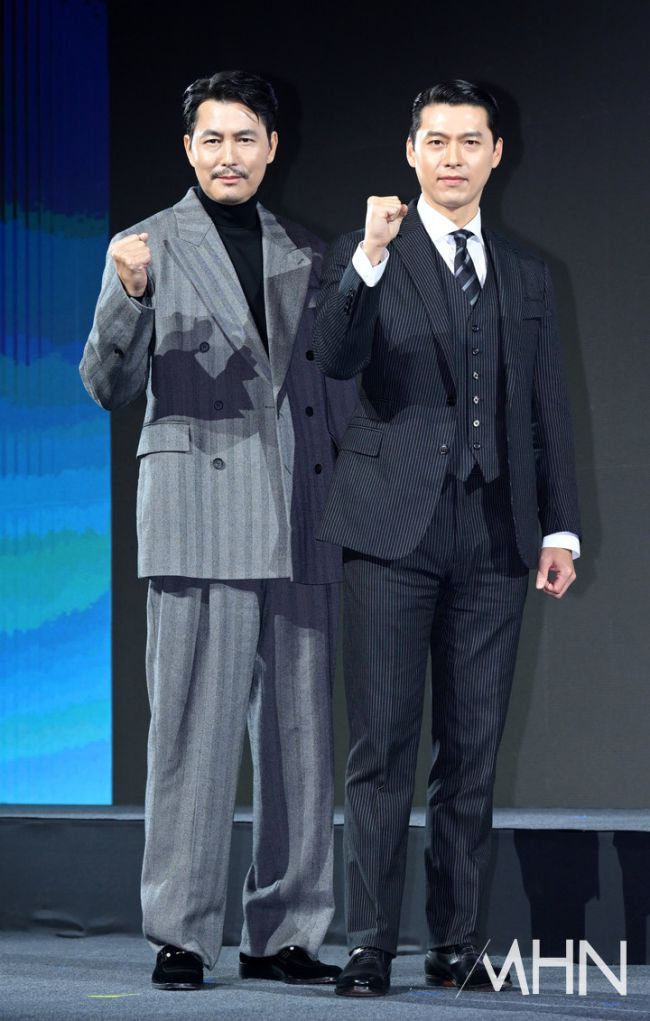 배우 정우성, 현빈이 16일 오전 서울 강남구 그랜드 인터컨티넨탈 서울 파르나스에서 열린 디즈니+ 오리지널 시리즈 '메이드 인 코리아' 제작발표회에 참석해 포즈를 취하고 있다. '메이드 인 코리아'는 1970년대 혼란과 도약이 공존했던 대한민국, 국가를 수익모델로 삼아 부와 권력의 정점에 오르려는 사내 '백기태'(현빈)와 그를 무서운 집념으로 벼랑 끝까지