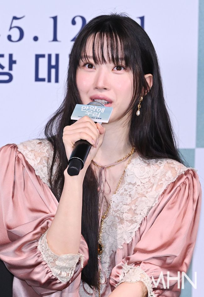 배우 문가영이 18일 오후 서울 용산구 CGV용산아이파크몰에서 진행된 '만약에 우리' 언론 시사회 및 기자간담회에 참석하고 있다. 기자간담회에는 김도영 감독과 배우 구교환, 문가영이 참석했다. '만약에 우리'는 뜨겁게 사랑했던 은호와 정원(문가영 분)이 10년 만에 우연히 재회하며 기억의 흔적을 펼쳐보는 현실 공감 연애를 그린 영화로, 중국 영화 '먼 훗날