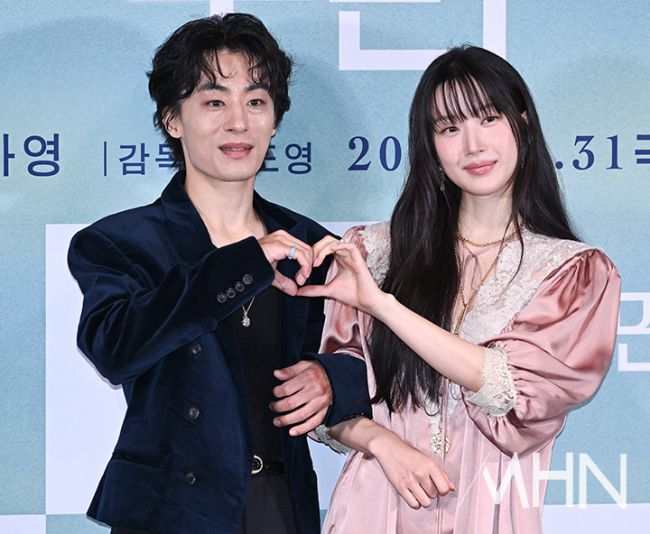 배우 구교환, 문가영이 18일 오후 서울 용산구 CGV용산아이파크몰에서 진행된 '만약에 우리' 언론 시사회 및 기자간담회에 참석해 포토타임을 갖고 있다. 기자간담회에는 김도영 감독과 배우 구교환, 문가영이 참석했다. '만약에 우리'는 뜨겁게 사랑했던 은호와 정원(문가영 분)이 10년 만에 우연히 재회하며 기억의 흔적을 펼쳐보는 현실 공감 연애를 그린 영화로