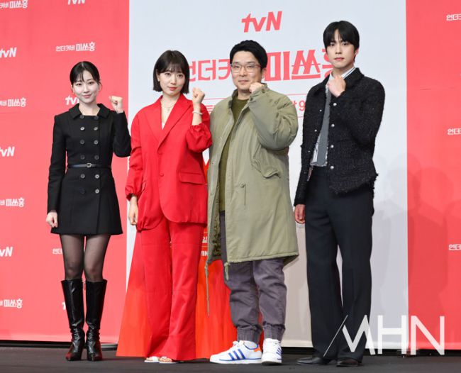 배우 하윤경, 박신혜, 조한결이 12일 오후 서울 구로구 더링크서울 호텔에서 열린 tvN 새 토일극 '언더커버 미쓰홍' 제작발표회에 참석해 포즈를 취하고 있다. '언더커버 미쓰홍'은 1990년대 세기말을 배경으로, 30대 엘리트 증권감독관 홍금보(박신혜)가 수상한 자금 흐름이 포착된 증권사에 20살 말단 사원으로 위장 취업하며 벌어지는 좌충우돌 레트로 오피