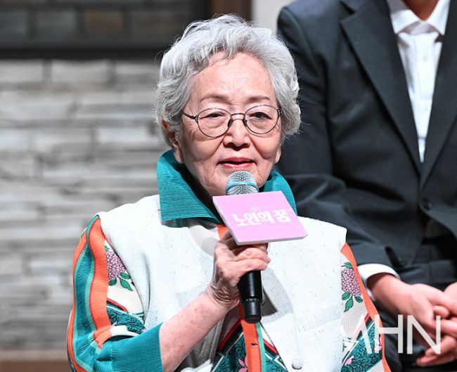 배우 김영옥이 13일 오후 서울 강서구 LG아트센터에서 진행된 '노인의 꿈' 기자간담회에 참석하고 있다. 연극 '노인의 꿈'은 그 세월의 두께가 다른 두 여자가 만나 서로의 주름을 어루만지는 이야기다. '노인의 꿈'은 1월 9일부터 3월 22일까지 LG아트센터 서울 유플러스(U+) 스테이지에서 공연된다.