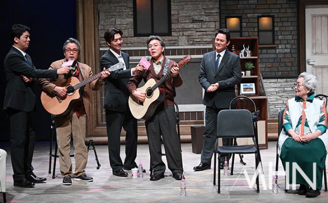 배우 박지일, 김승옥이 13일 오후 서울 강서구 LG아트센터에서 진행된 '노인의 꿈' 기자간담회에 참석해 기타를 치고 있다. 연극 '노인의 꿈'은 그 세월의 두께가 다른 두 여자가 만나 서로의 주름을 어루만지는 이야기다. '노인의 꿈'은 1월 9일부터 3월 22일까지 LG아트센터 서울 유플러스(U+) 스테이지에서 공연된다.