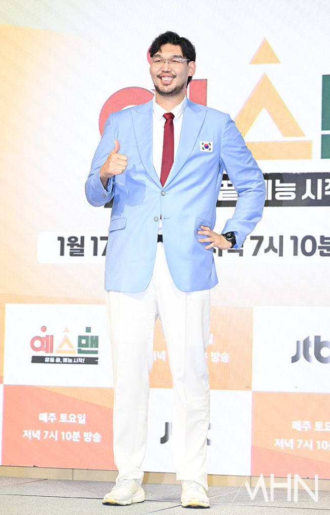 하승진이 14일 오후 서울 영등포구 페어몬트 앰배서더 서울에서 진행된 JTBC의 신규 예능 '예스맨' 제작발표회에 참석해 포토타임을 갖고 있다. 제작발표회에는 최창수CP, 김동욱PD, 서장훈, 안정환, 기보배, 박태환, 이형택, 하승진, 윤석민, 김영광이 참석했다. '예스맨'은 '예능 스포츠맨'의 줄임말로, 대한민국을 대표하는 스포츠 레전드들이 출연해 자신