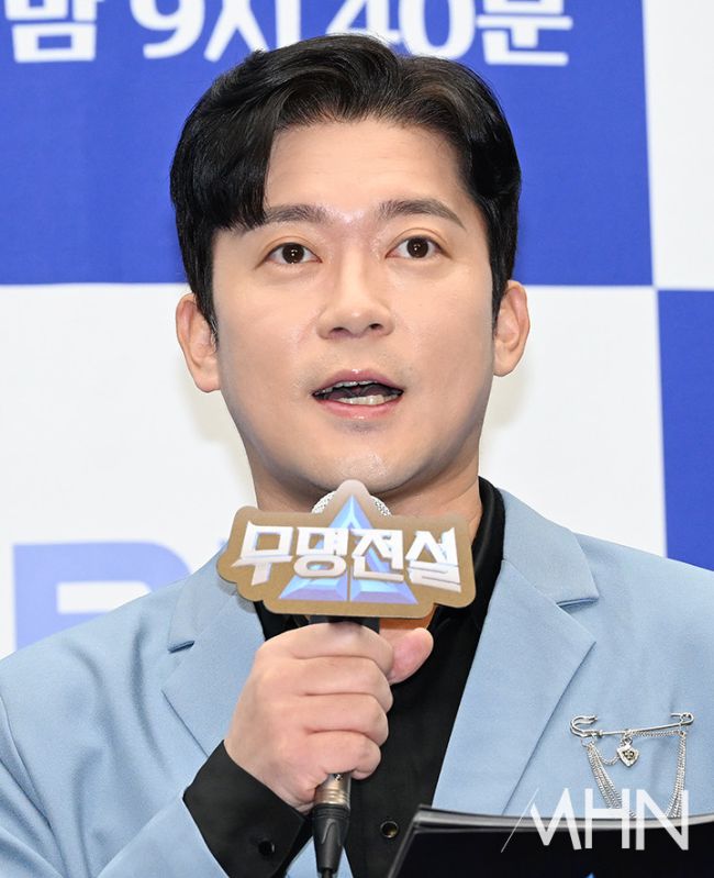 방송인 김대호가 25일 오전 서울 마포구 상암 스탠포드 호텔에서 진행된 오디션 프로그램 '무명전설' 제작발표회에 참석해 진행을 하고 있다. 제작발표회에는 김우진PD와 장민호, 김대호, 남진, 주현미, 조항조, 신유, 강문경, 손태진, 임한별, 양세형이 참석했다. MBN 초대형 오디션 프로그램 '무명전설-트롯 사내들의 서열전쟁'은 99인의 도전자들이 단 하나