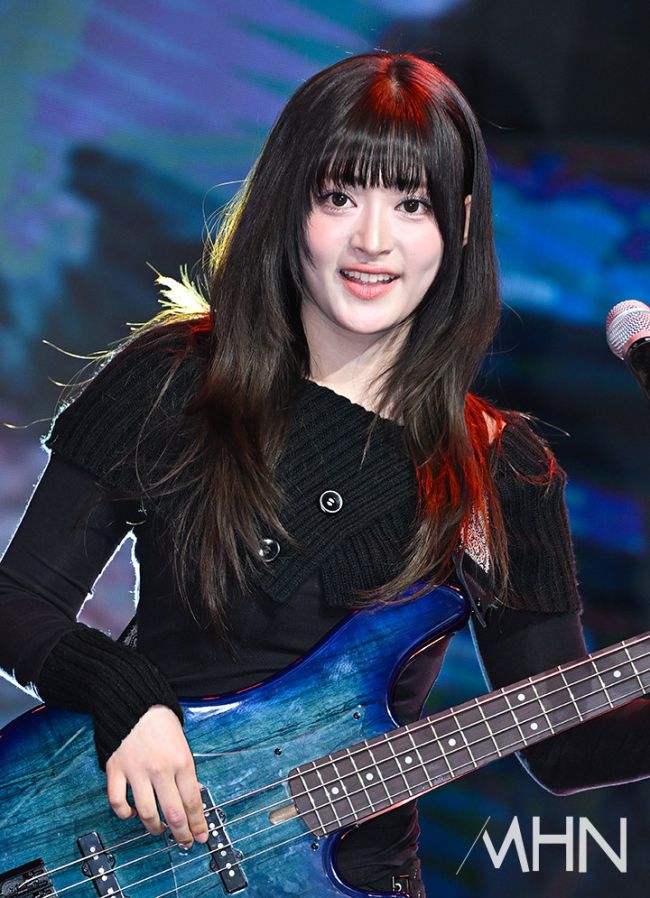 여성 밴드 레이턴시(LATENCY) 세미가 18일 오후 서울 마포구 쇼킹케이팝센터에서 진행된 첫 미니앨범 '레이트 어클락'을 발매 기념 쇼케이스에서 신곡을 선보이고 있다. 첫 미니앨범 '레이트 어클락'('LATE O'CLOCK') 타이틀 곡 제목은 팀명과 같은 'LATENCY'로 밴드가 지닌 정체성과 메시지를 가장 직관적으로 담아내며, 레이턴시의 특별한 시