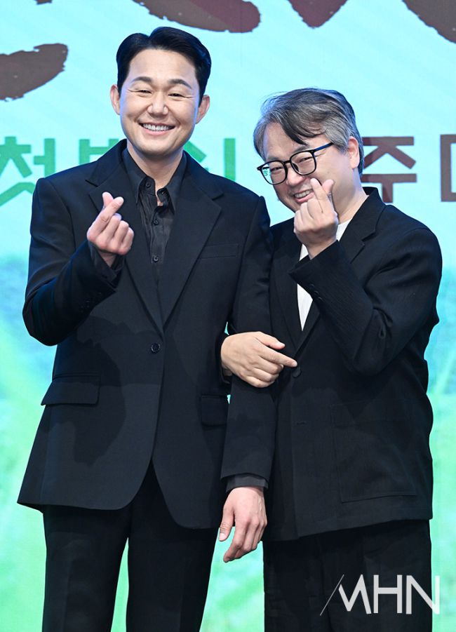 배우 박성웅, 이서환이 25일 오후 서울 구로구 더 세인트에서 진행된 드라마 '심우면 연리리' 제작발표회에 참석해 포토타임을 갖고 있다. 제작발표회에는 최연수 감독과 배우 박성웅, 이수경, 이서환, 남권아, 이진우, 최규리가 참석했다. KBS 2TV 새 미니시리즈 '심우면 연리리'는 청정 살벌 구역 '연리리'로 뚝 떨어진 찐 도시 가족 성태훈가(家)가 서울