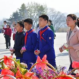 김일성 생일 맞아 헌화하는 북한 주민들