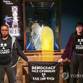 英왕실 호화 왕관, 시위대에 봉변…진열장에 음식물 투척