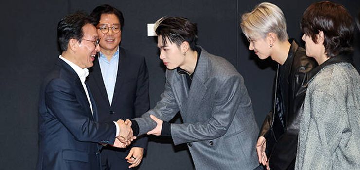 엔하이픈 멤버들과 인사 나누는 김민석 국무총리